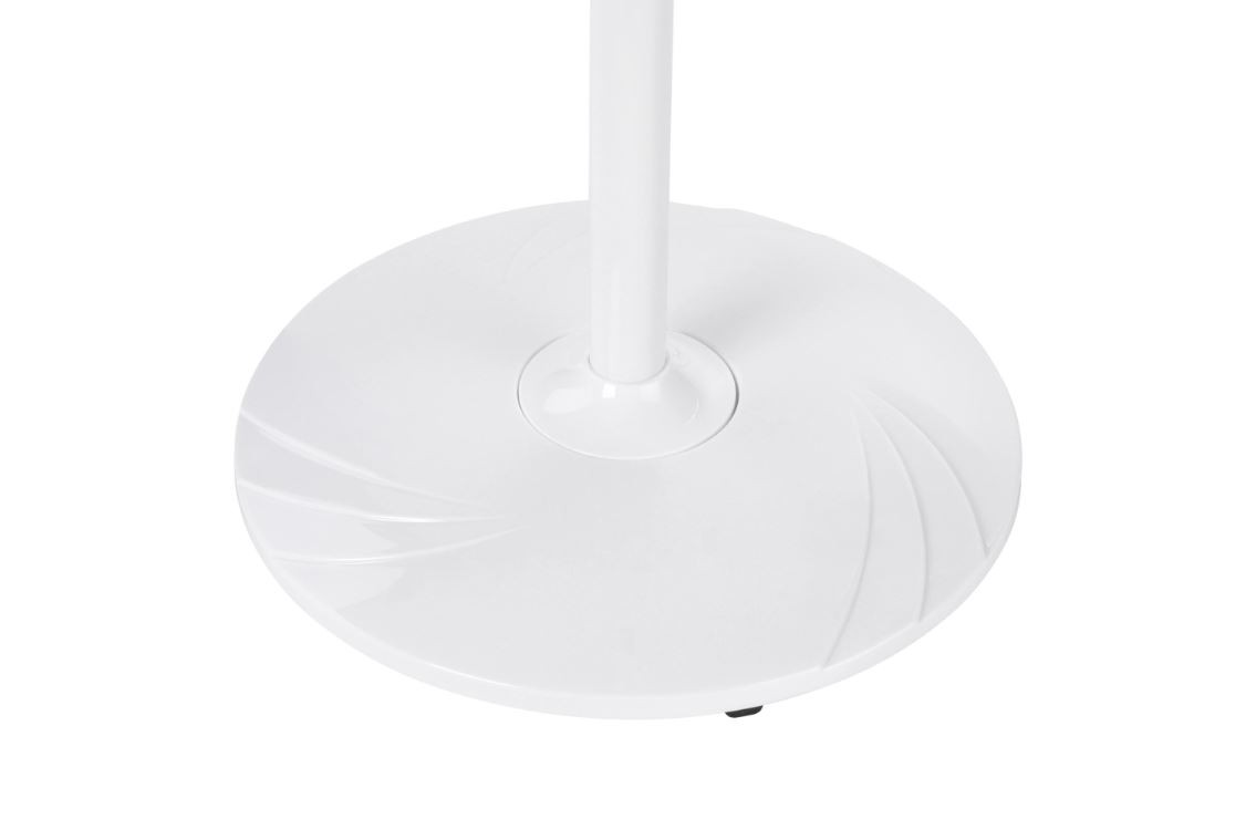 თეთრი ფერის დასადგამი ვენტილატორი დისტანციური მართვის პულტით და მრგვალი საყრდენით. მოდელი დამზადებულია საიმედო, პრაქტიკული და გამძლე მასალისგან.